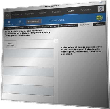 En seta pestaña puede añadir todo tipo de documentos para adjuntar al historiar del paciente puede adjuntar cualquier tipo de document0 archivos, pdf, radrigrafias, imágenes, videos, puede realizar directamente una foto o un video simplemente dejando el dedo pulsando en el campo he indicándole que quiere.
