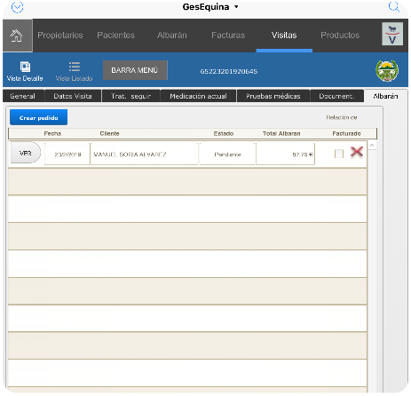 Siguiendo con el proceso en su visita, desde la pestaña de facturación puede realizar directamente un albarán con los trabajos , medicamentos, gastos de desplazamiento, pruebas médicas, etc.