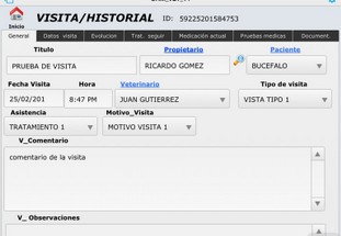 En el panel de visitas dispone de datos importantes relacionados con esa visita con los datos de Propietario y paciente, fecha y hora de la visita, tipo de visita y motivo de la misma, comentarios generales de la visita, observaciones, etc.